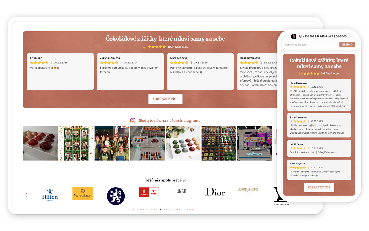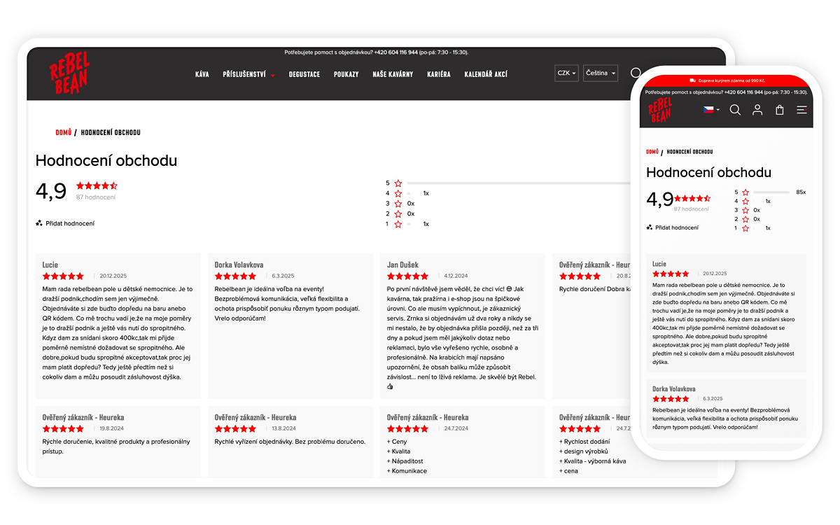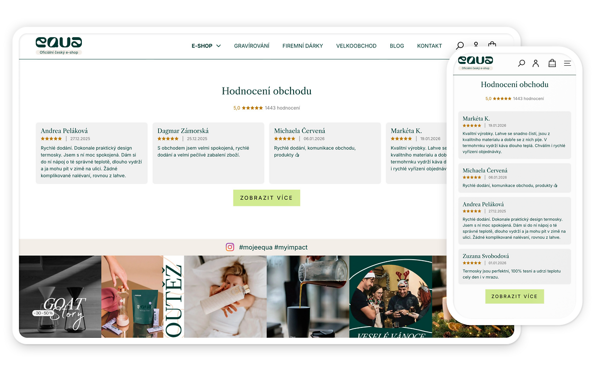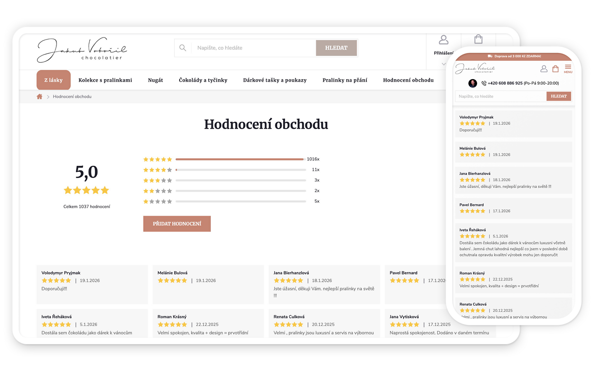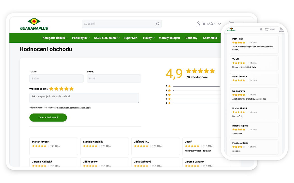 Doplněk na jeden klik zobrazí recenze vašeho e-shopu na hlavní stránce, hezky, přehledně a moderně. Takto zobrazené recenze zvyšují důvěryhodnost e-shopu, a to hlavně u pro nové zákazníky. Příjemným bonusem je splnění nové legislativy, dle které je e-shop povinen zobrazovat, zda je recenze ověřená a její původ.