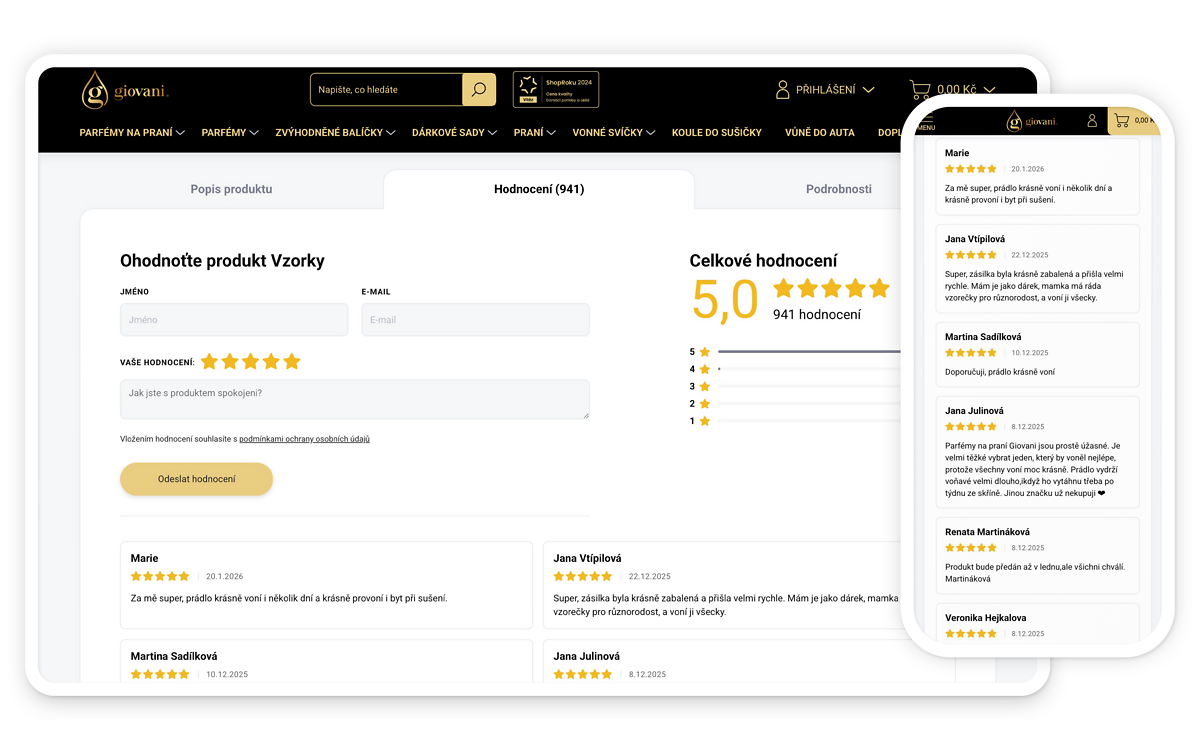 S doplňkem Hodnocení produktů+ můžete zobrazit hodnocení produktů na detailu produktu přehledně a intuitivně, takže se zákazníci budou v recenzích snadno orientovat a budou mít chuť si je přečíst.