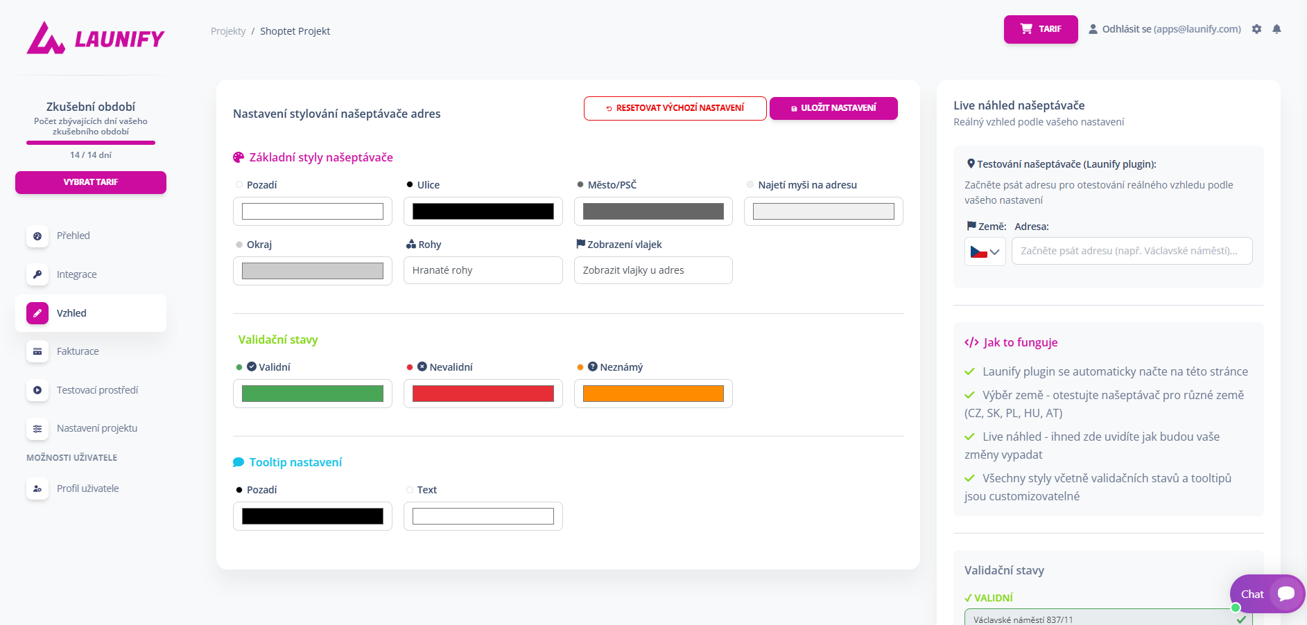 Doplněk si můžete snadno sladit s designem vašeho e-shopu. V administraci si nastavíte barvy textu, pozadí i zvýraznění validních/nevalidních údajů, aby vše působilo přirozeně a nerušilo zákazníka v checkoutu.