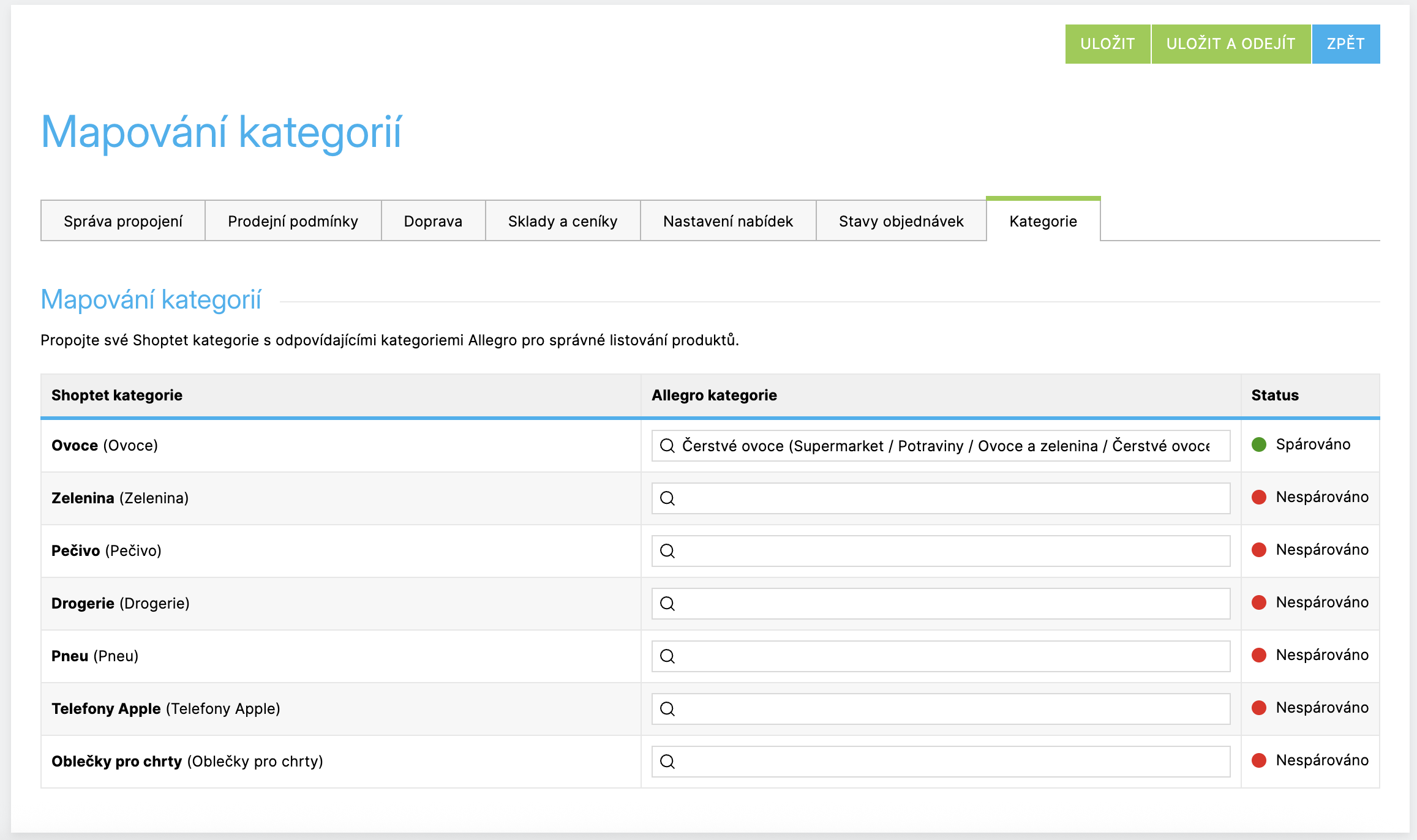 - Mapovat kategorie z e-shopu do kategorií marketplace