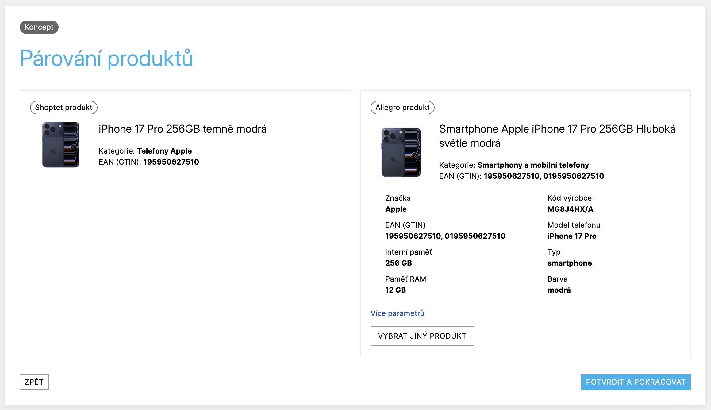 - Automaticky párovat produkty dle EAN, GTIN nebo názvu