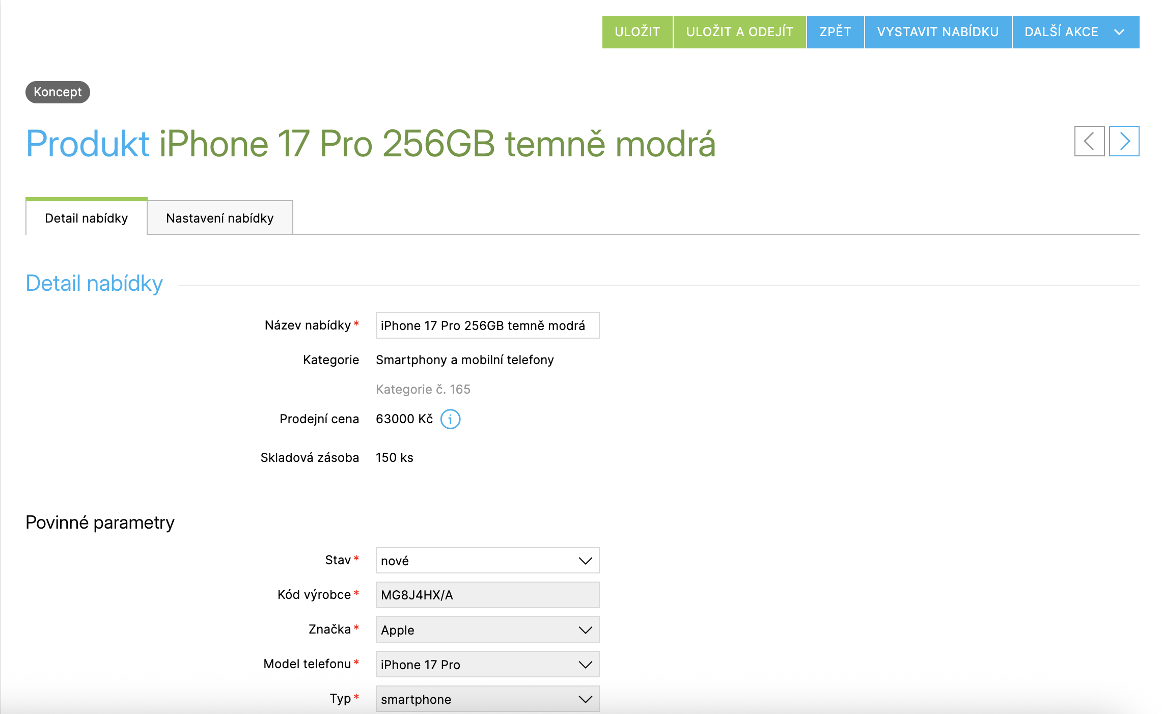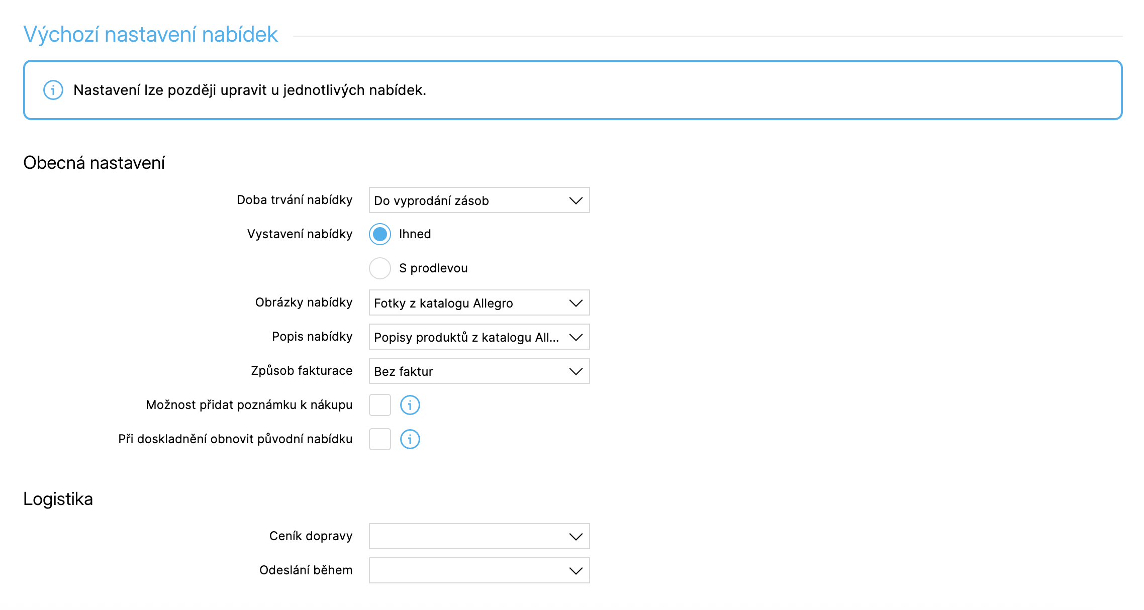 Díky výchozím nastavením si výrazně urychlíte práci při vystavování většího množství produktů a udržíte jednotná pravidla napříč nabídkami.