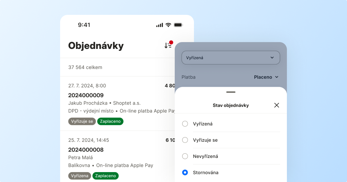 - Změna stavu objednávek pod palcem. Mějte pod kontrolou všechny přijaté objednávky. Zobrazte si detaily a pohodlně změňte jejich stavy.