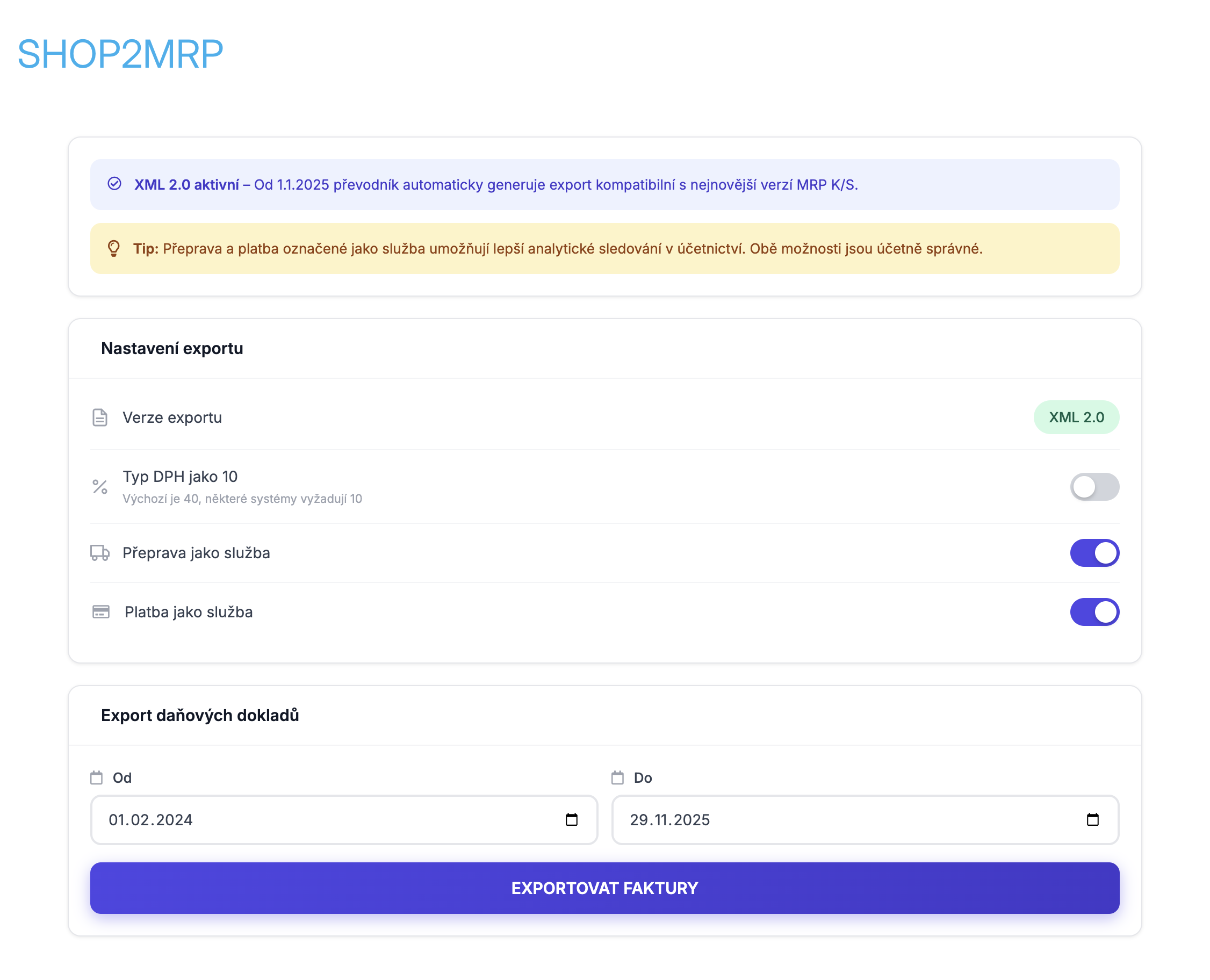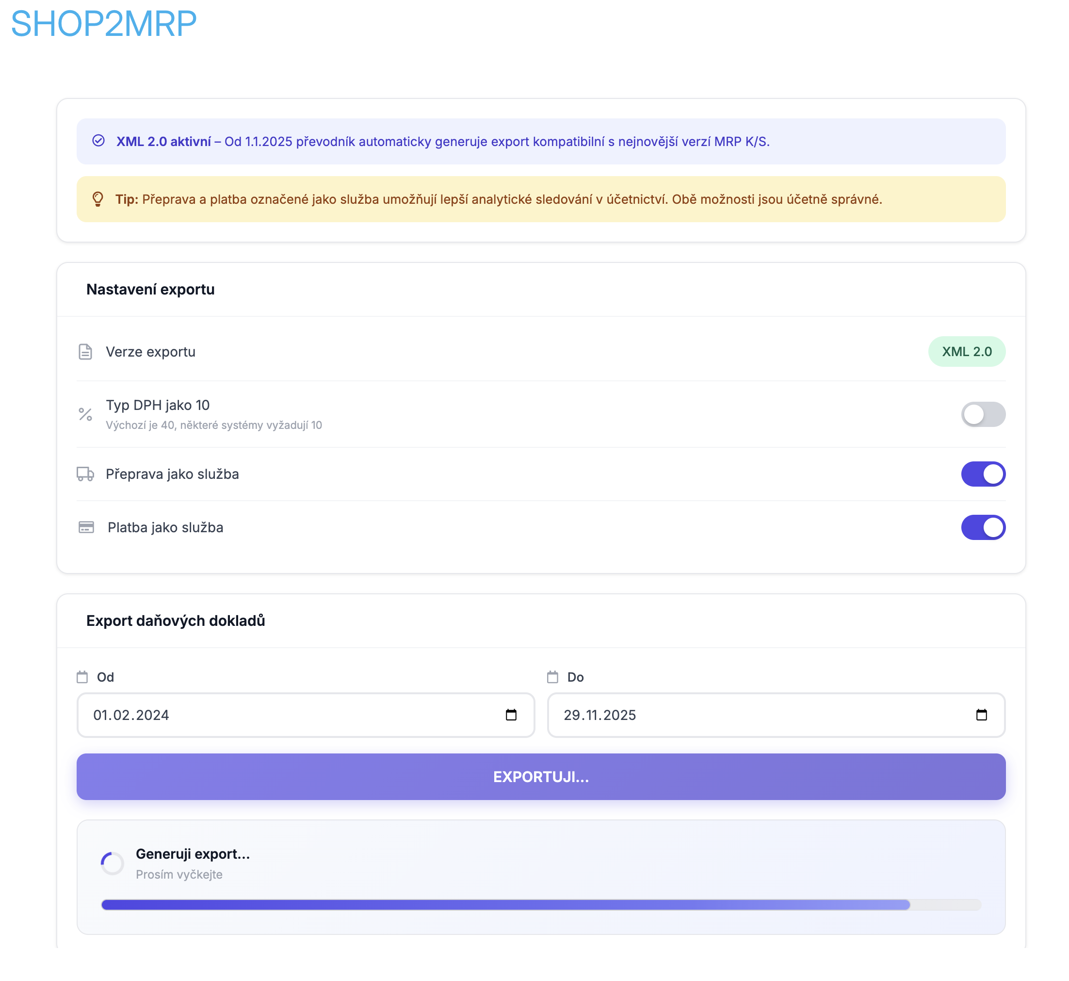 - Rychlý a bezchybný přenos daňových dokladů vytvořených v Shoptetu do programu MRP-K/S ale aj MRP-VISUAL