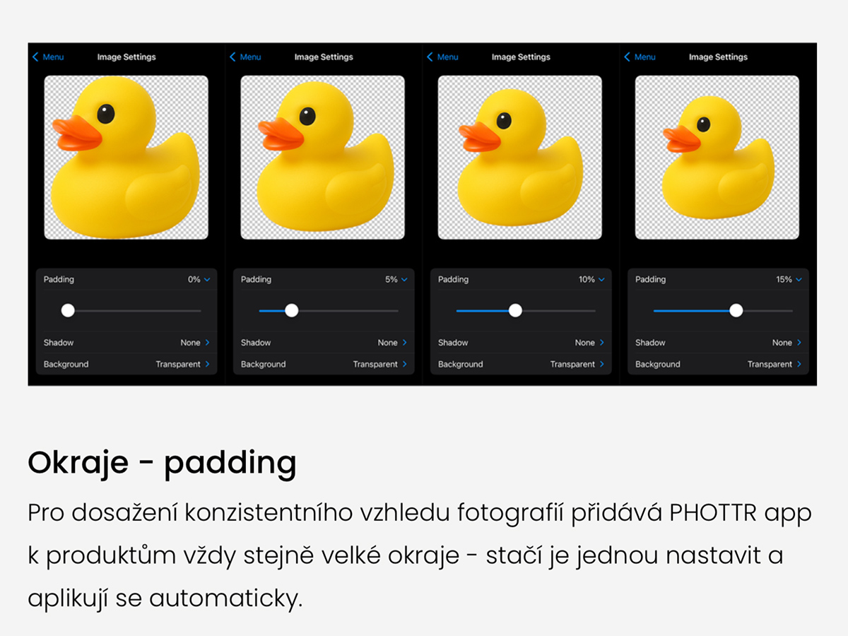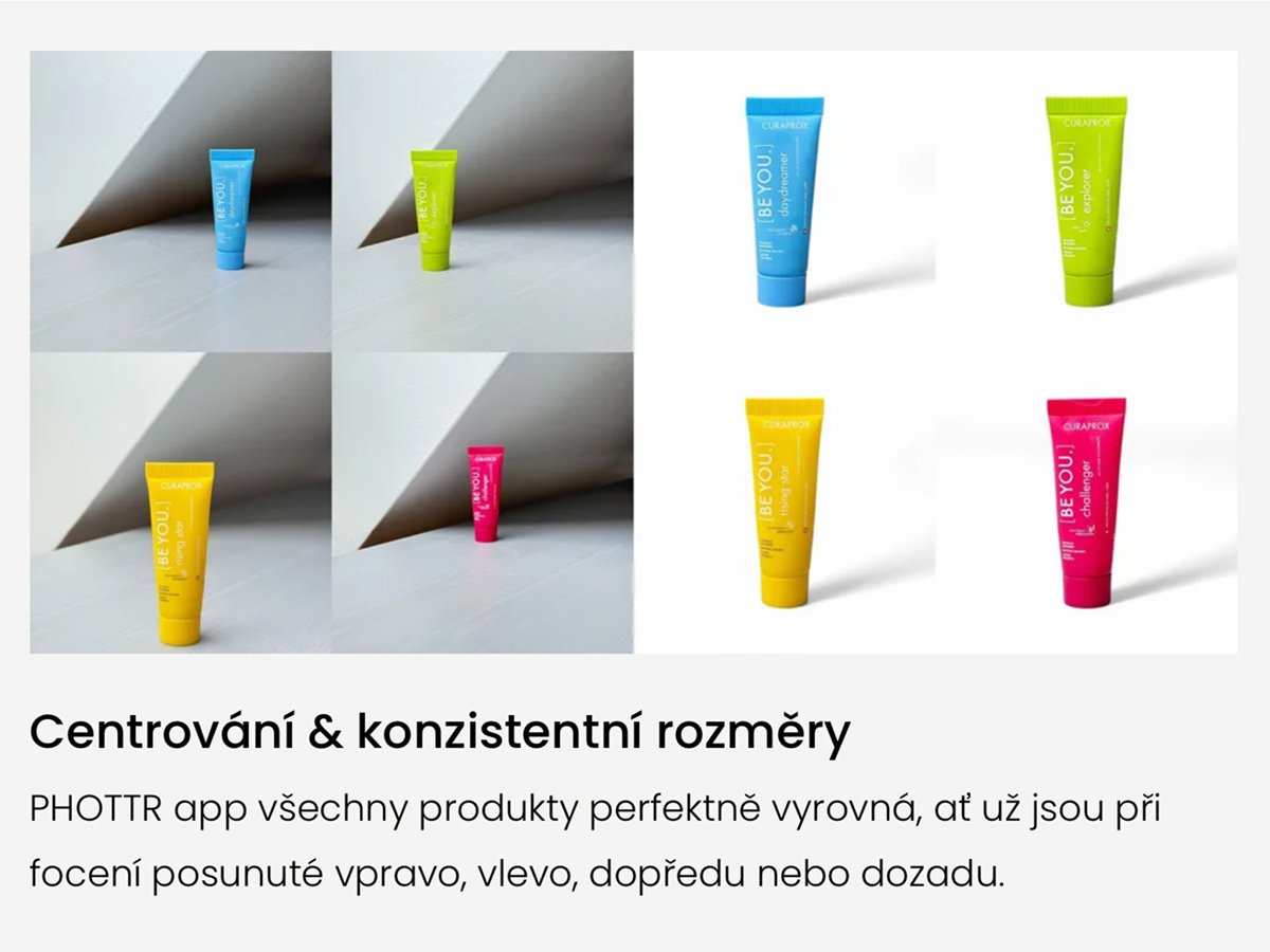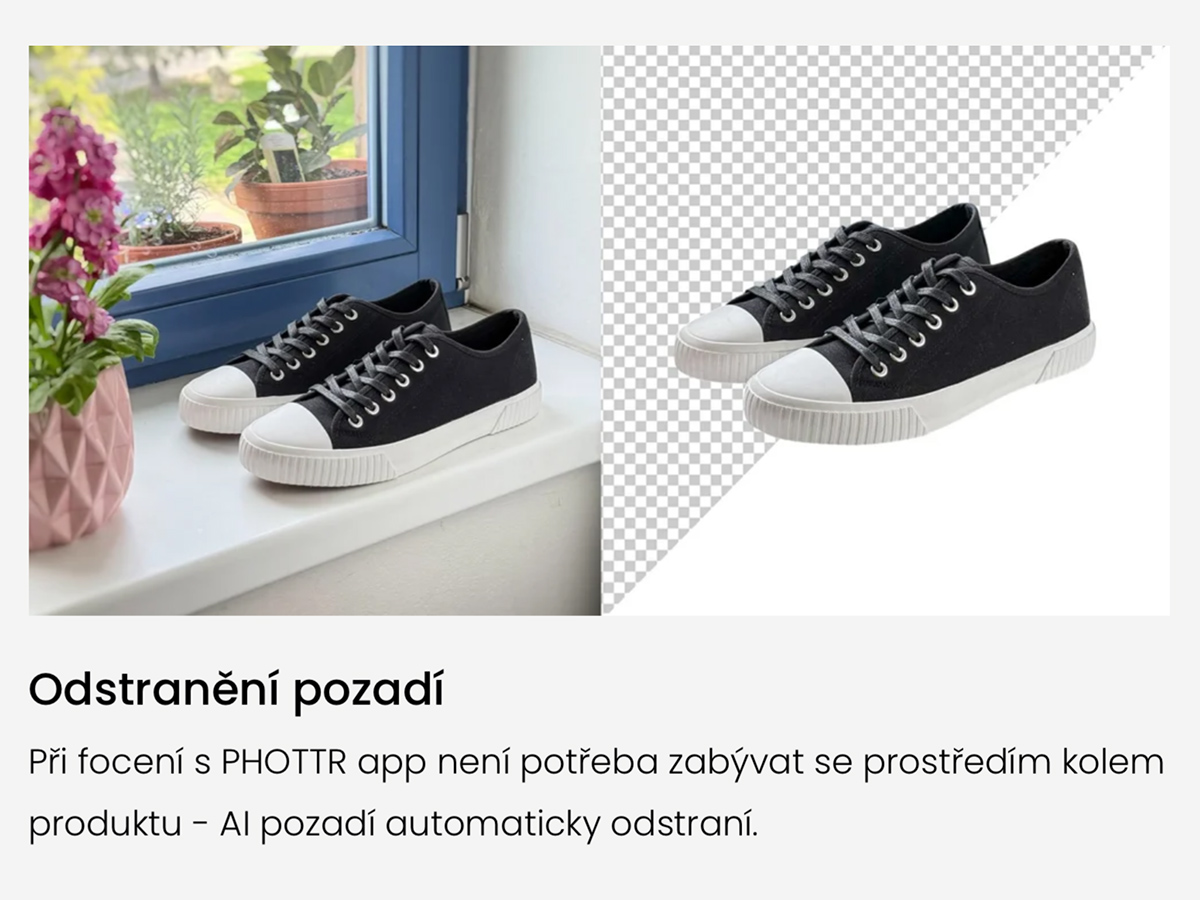 PHOTTR je mobilní aplikace pro iOS (iPhone) telefony, která vám umožní jednoduše pořídit a automaticky upravit produktové fotografie na profesionální úroveň – s čistým pozadím, vycentrovaným produktem a realistickým stínem. Díky integraci se Shoptetem pak můžete tyto fotky exportovat přímo do administrace svého e-shopu, kde se automaticky spárují s produkty podle jejich kódu.
