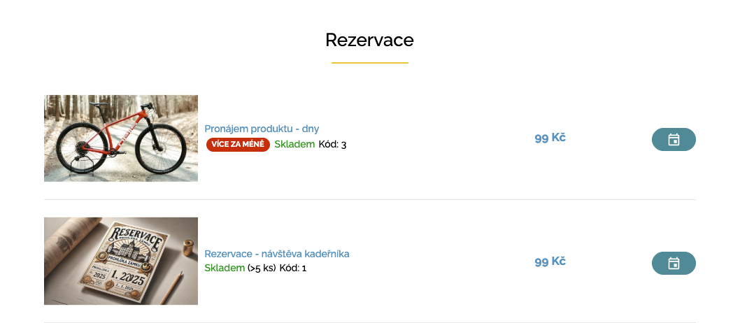 - Košík: 1 kus = 1 rezervace; po dokončení objednávky se rezervace samo založí a spáruje.