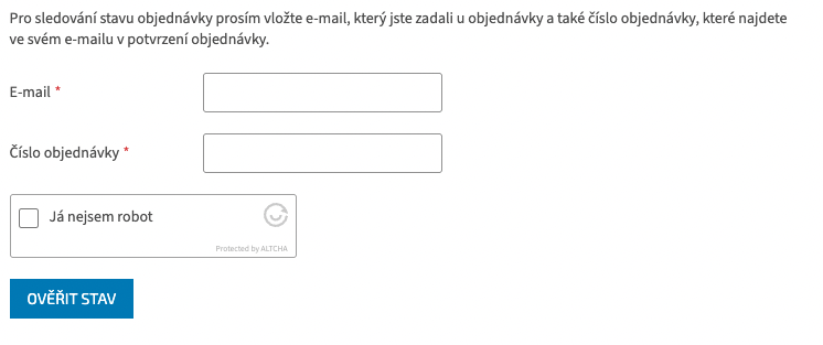 Doplněk funguje jako formulář, který lze vložit prakticky kamkoliv na e-shop. Zákazník do něj zadá svůj e-mail a číslo objednávky a ihned uvidí detail objednávky včetně aktuálního stavu. Formulář je zabezpečen technologií Altcha proti robotům.