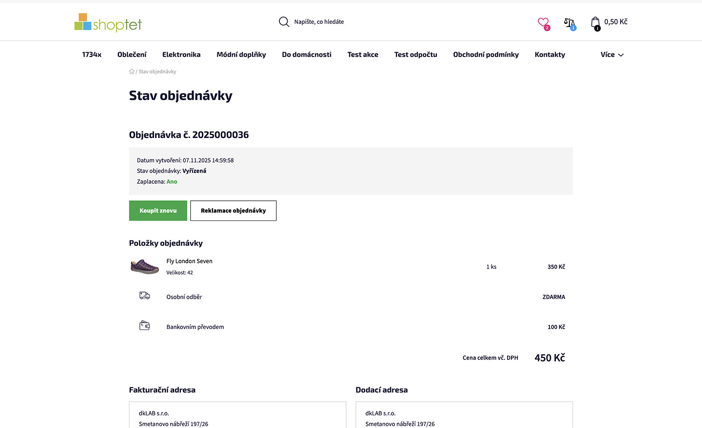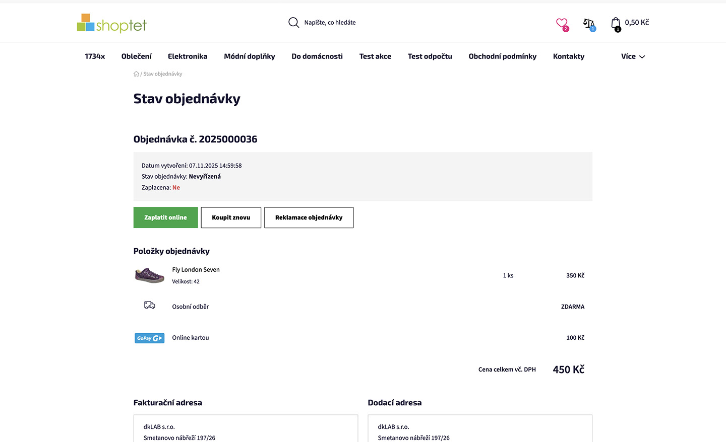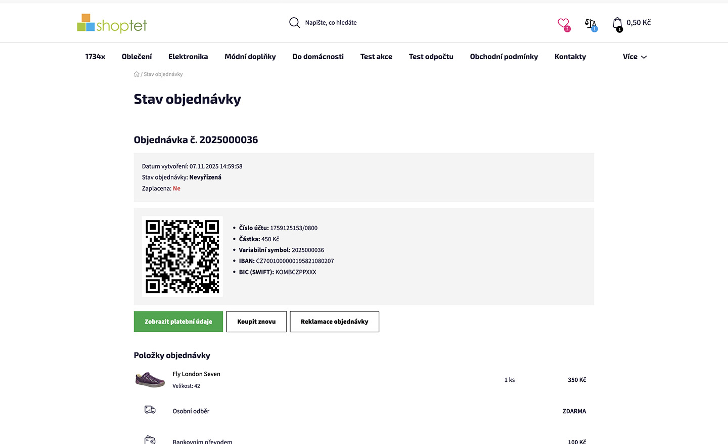 - Platba neuhrazené objednávky – tlačítko pro přechod na platební bránu nebo zobrazení platebních údajů pro bankovní převod