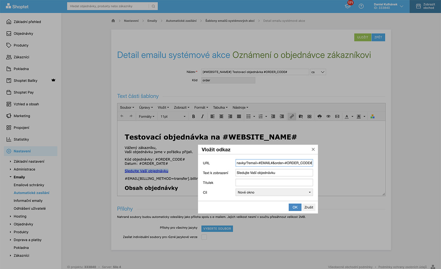 - Zapnutí či vypnutí odkazu pro sledování zásilky.