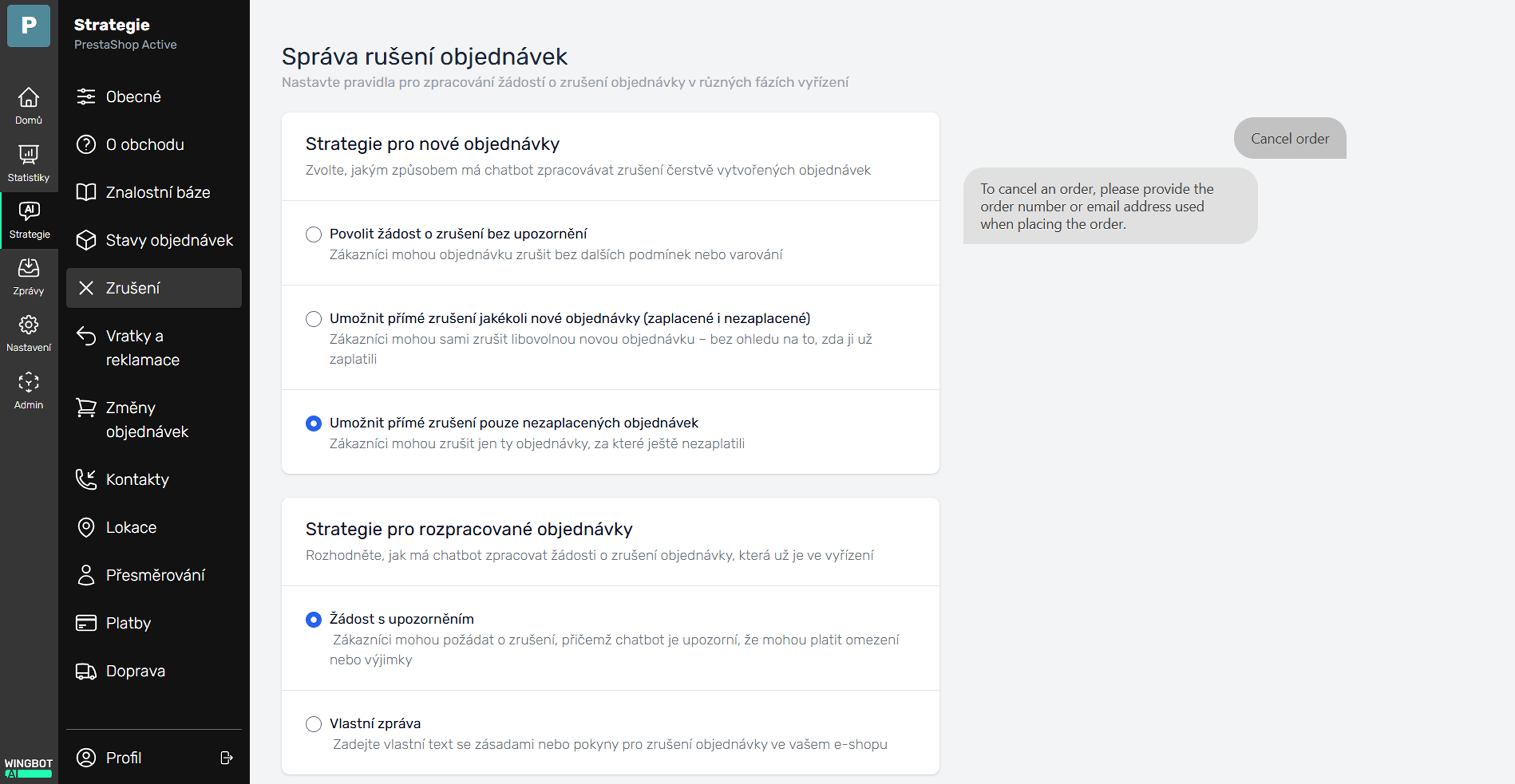 - Přizpůsobení na jedno kliknutí – Vzhled, osobnost i tón chatu lze upravit podle vašeho e-shopu. Stejným způsobem nastavíte pravidla pro zpracování objednávek, práci s kontakty, platbami a předávání konverzací lidské podpoře.